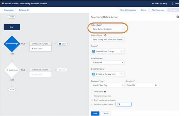 Si vous utilisez les enquêtes dans votre organisation, vous pourrez ajouter une action dans votre process builder qui vous permettra d’envoyer une enquête par mail.