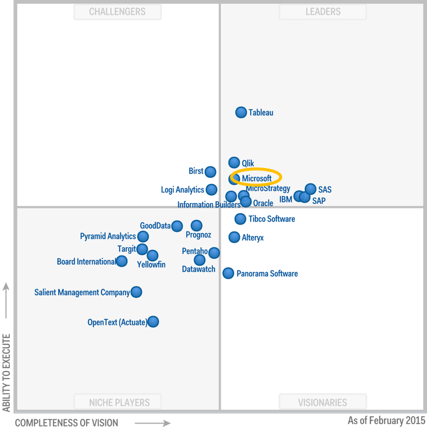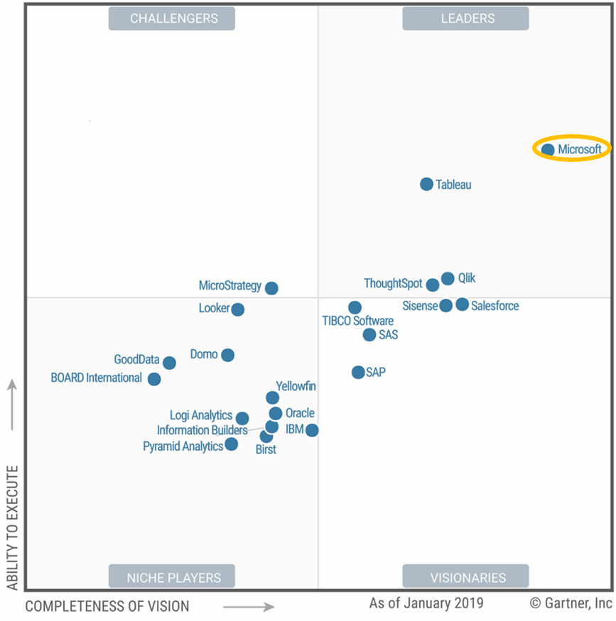 En 2015 Microsoft BI est noyé parmi tous les acteurs de la BI. En 2019, Microsoft apparaît comme le leader visionnaire du marché des éditeurs de BI.