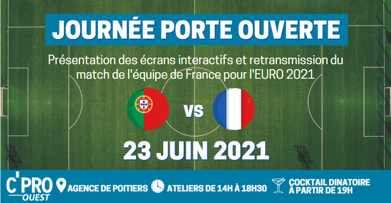 Pour terminer cette journée Porte Ouverte, l’agence de Poitiers organise un afterwork football à partir de 19h. Le match de l’équipe de France, face au Portugal pour l’EURO 2021, sera retransmis en live sur nos écrans F&VL ! Un cocktail dinatoire accompagnera cette soirée.
