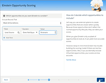 Lors de la configuration du Score des opportunités et Einstein, vous pouvez demander à Einstein d’analyser uniquement les opportunités qui remplissent certaines conditions (Montant / Status / Source / Date…). Vous pouvez également déterminer si des champs doivent être exclus du calcul du score