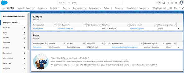 • Évolution de la recherche globale (en haut de Salesforce) : retrouver un résultat pour un objet standard ayant été renommé (compte, requête, prospect, contact et opportunité). Disponible uniquement en Anglais pour l’instant.