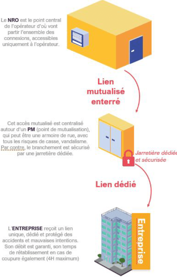 La fibre FTTE repose sur une architecture dite semi-mutualisée : la liaison entre le NRO (Nœud de Raccordement Optique) et le point de mutualisation (PM) est enterrée et partagée entre plusieurs entreprises, tandis que la jarretière optique reliant le PM aux locaux de l’entreprise est, elle, dédiée et sécurisée.